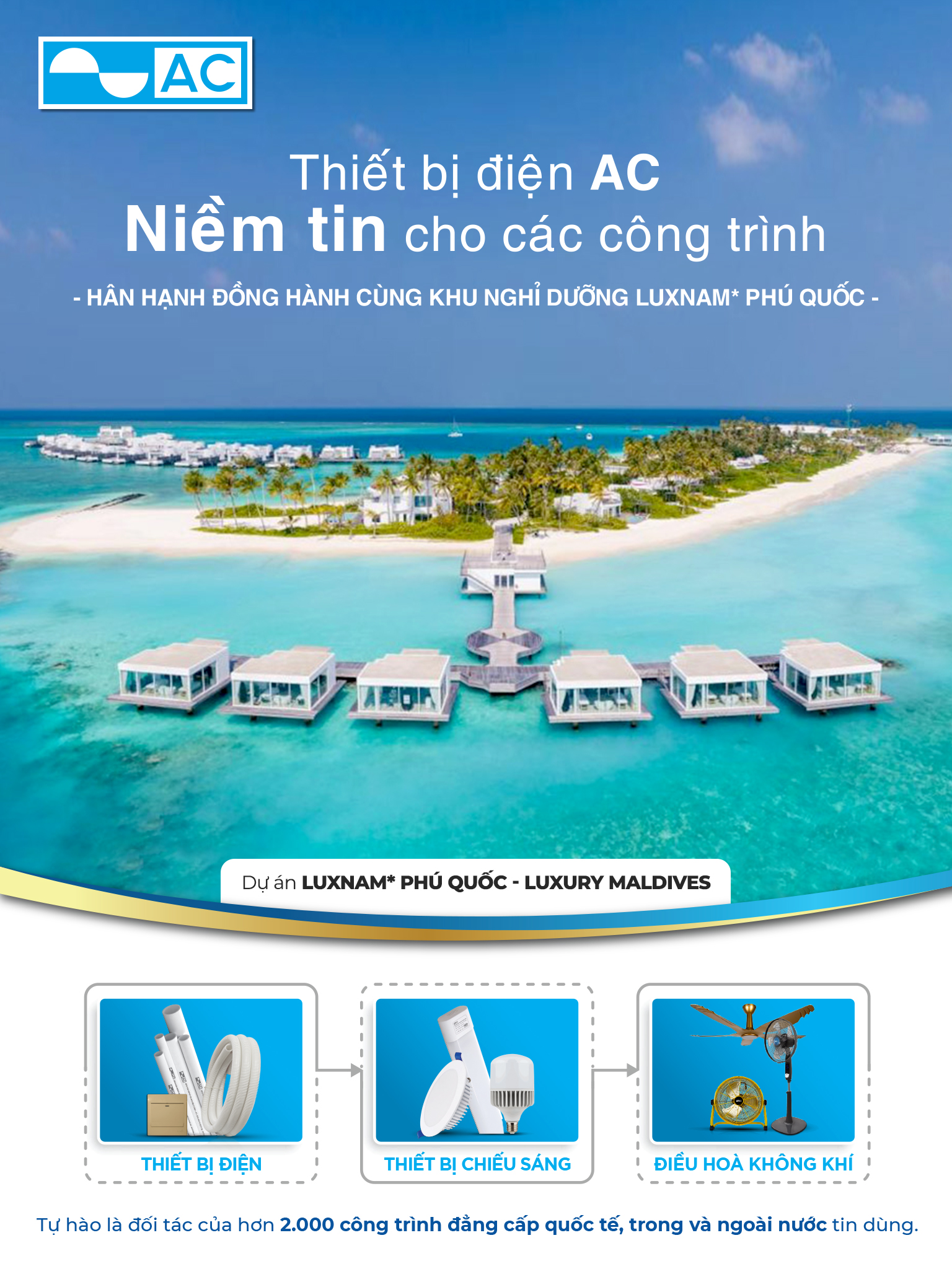 Từ các dự án dân dụng, cao ốc văn phòng, cho đến những công trình biểu tượng trên biển như LUXNAM Phú Quốc*, AC luôn khẳng định vị thế là thương hiệu ống luồn dây điện được tin dùng hàng đầu.