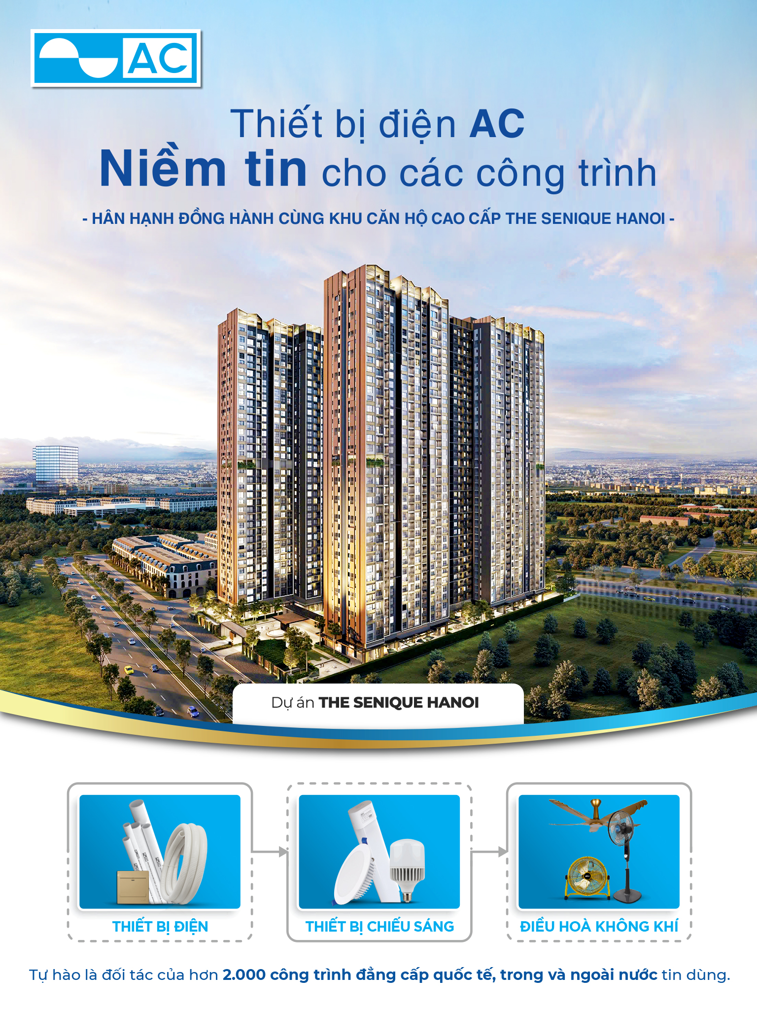 Không chỉ đồng hành cùng The Senique Hà Nội, thương hiệu AC đã và đang góp mặt trong hàng nghìn công trình quy mô lớn trên khắp Việt Nam. Từ thiết bị điện, thiết bị chiếu sáng cho đến giải pháp điều hòa không khí, AC luôn đảm bảo chất lượng đạt chuẩn quốc tế, mang lại sự tin cậy tuyệt đối cho chủ đầu tư, nhà thầu và cư dân.